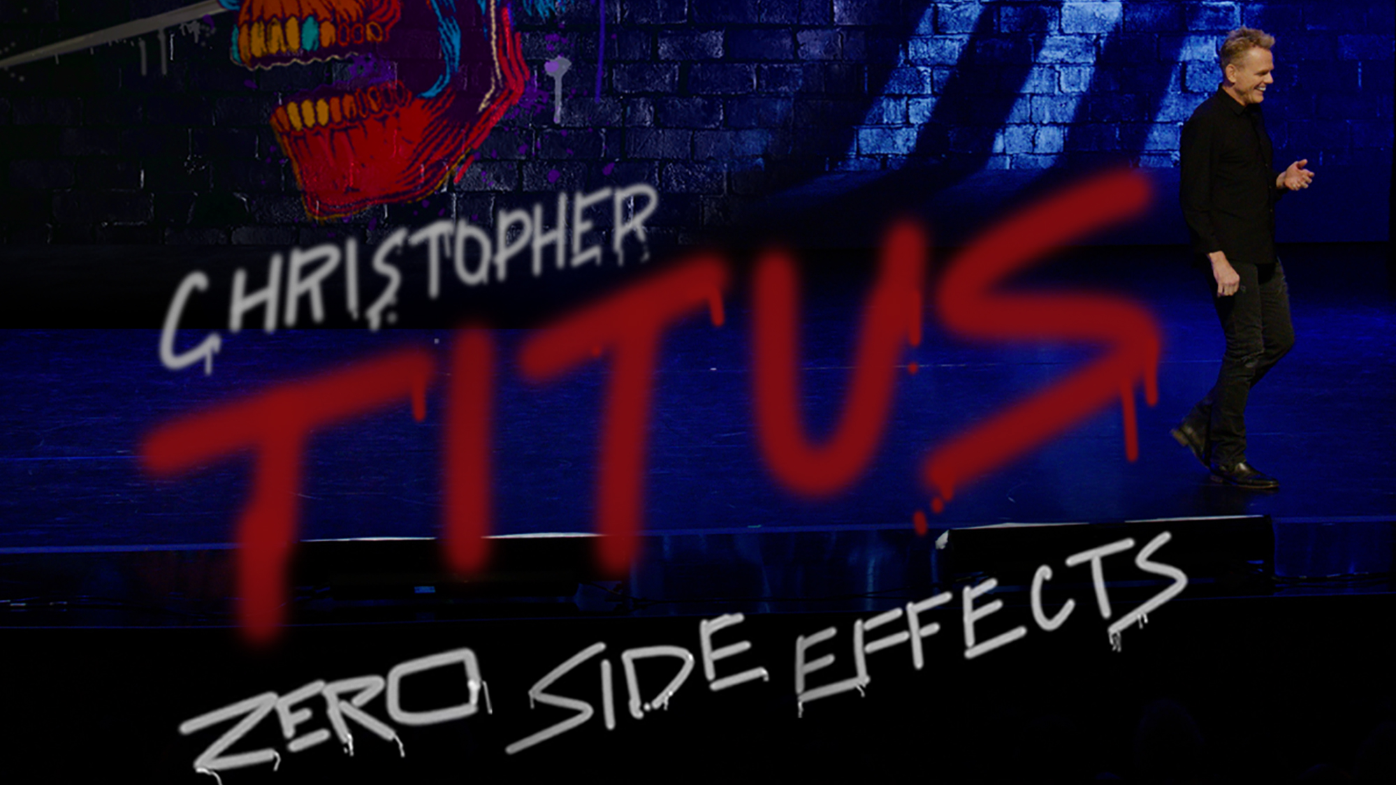 Known for leaving no stone unturned, especially within his own life and family, Titus takes you on a comedic ride that will make you think, and leave you exhausted from laughter. To see one of Christopher Titus' shows, is to love him. Filmed at the historic El Portal Theater in North Hollywood, CA, Titus performed his tenth special, “Zero Side Effects," to a sold out crowd, where he took on topics like White Supremacy, he apologizes to Millenials and Gen Z, and he recounts in painful detail, his life-altering near-death dental experience, in the way only Titus can.